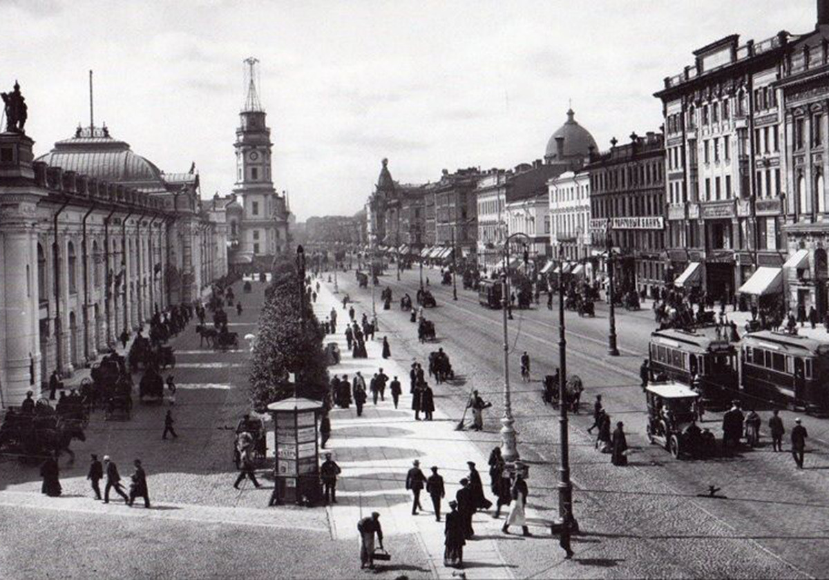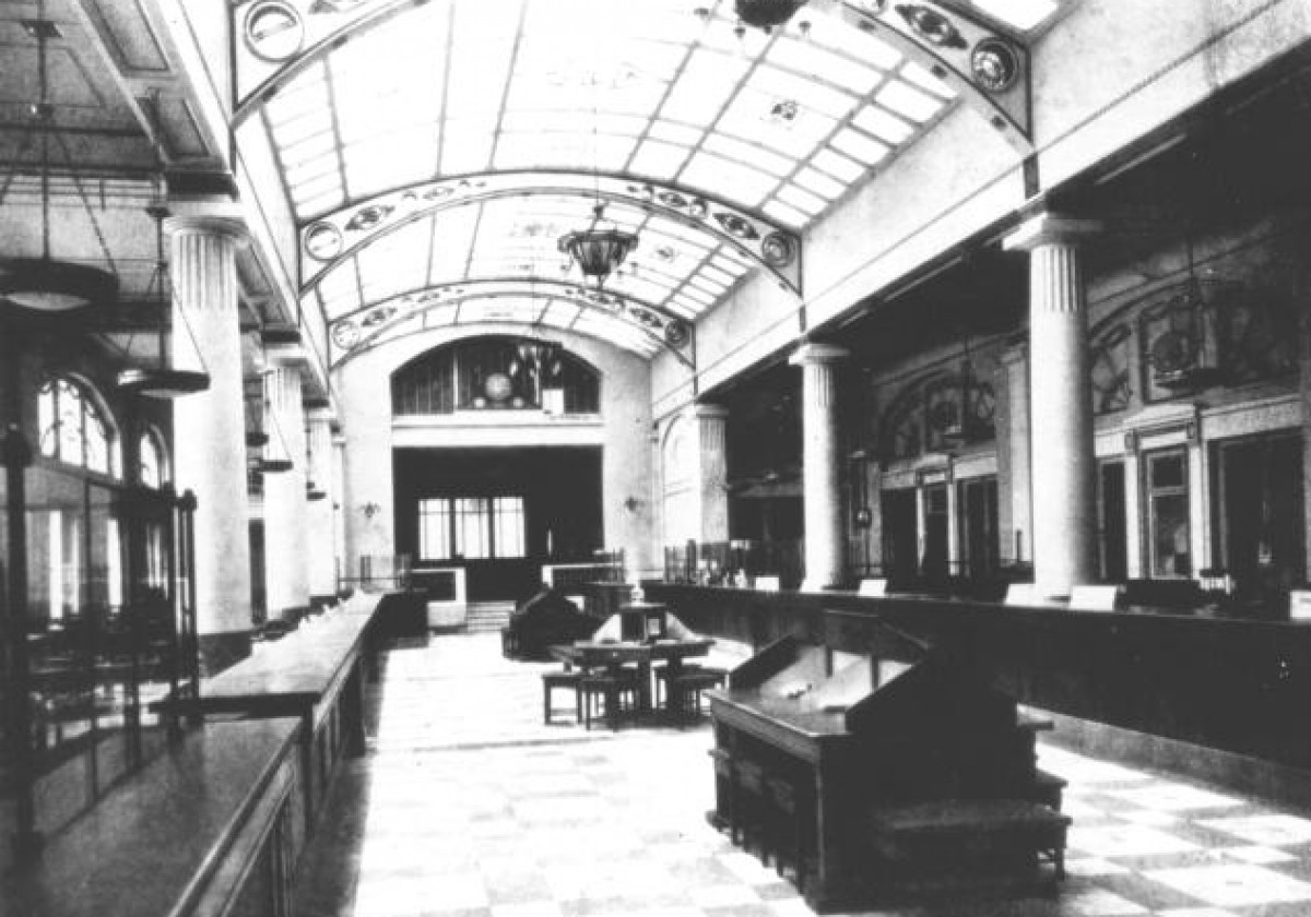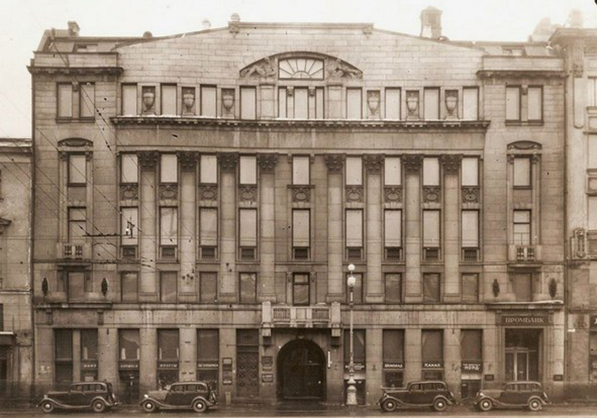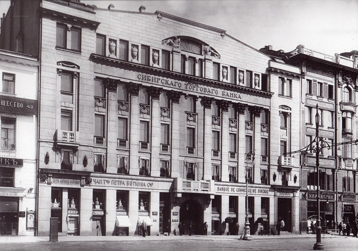 В 1907 году участок по адресу Невский проспект, 44, перешел во владение Сибирского торгового банка, а находящееся на нем здание кардинально перестроено в 1908–1910 годах по проекту Б. И. Гиршовича. В первую очередь был сооружен операционный зал с двумя рядами колонн и верхним светом (это помещение можно увидеть и сейчас). Фасад надстроенного лицевого корпуса был облицован серым гранитом, украшен пилястрами и завершен широким трапециевидным фронтом в духе петербургского неоклассицизма.